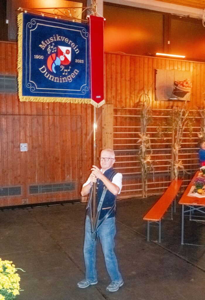 Übergabe der neuen Staandarte durch Ehrendirigent Siegmund Oehler an den 1.Vorsitzenden des MV Dunningen Dominik Wilbs